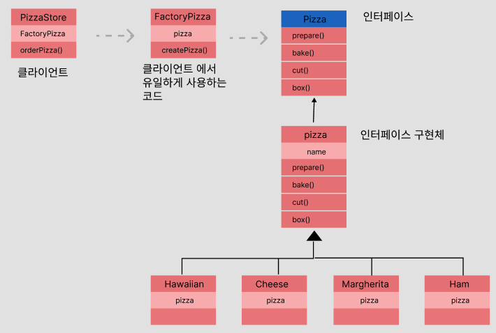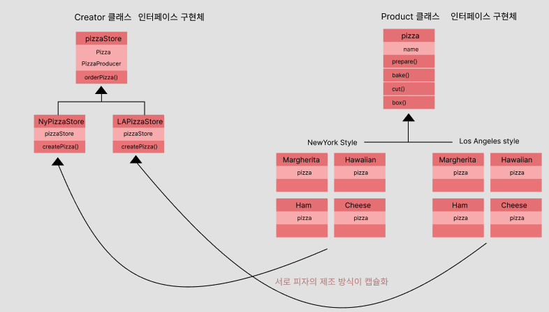 이렇게 특정 피자 가게 의 주입을 넣어줄 수 있으면서 피자 생성이 가능해진다. 이렇게 생산된 피자의 제조 방법 은 모두 캡슐화되어 관리된다. 그림으로 보면 아래와 같다.