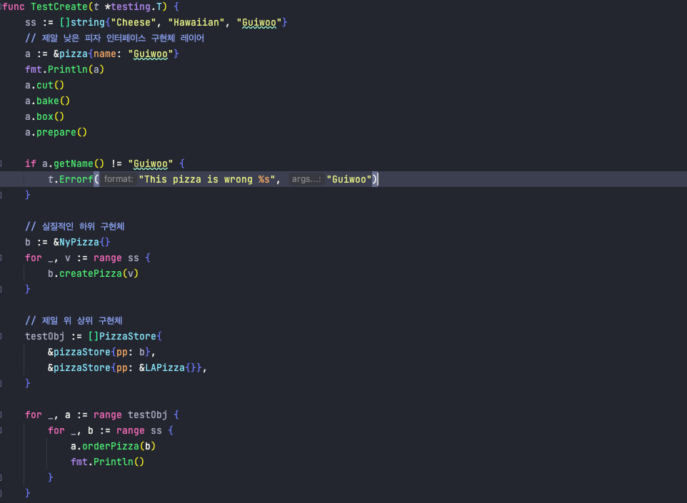 a := &pizzaStore{pp: &NyPizza{}} // 피자 의 프로듀서 를 각각 주입 해준다.