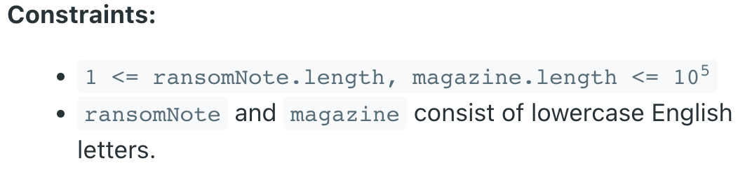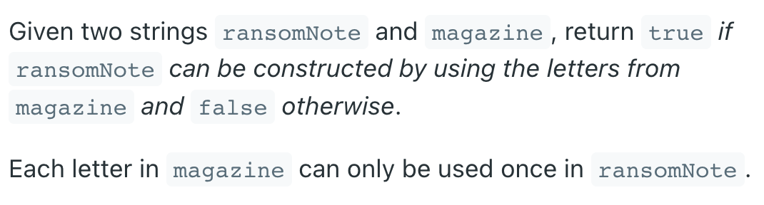 문제 가 그 답지 어렵지 않다, 주어지는 두 개의 문자 중 하나의 문자를 이용해 다른 문자를 만들 수 있는지 물어보는 부분이다. 이것 역시 알파벳 소문자만 주어지기 때문에 배열로 바로 코드 치러가자.