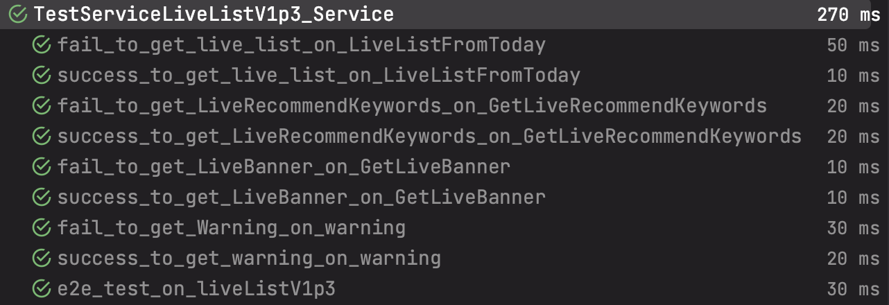 해당 서비스에서는 LiveListInject 인터페이스를 주입받아 호출을 하게 된다면? 성공 실패 원하는 주입을 통해 테스트를 효과적으로 할 수 있다.