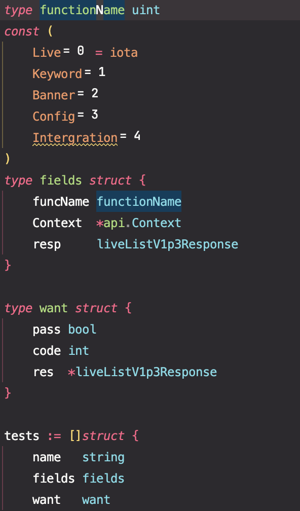 위와 같은 방식으로 functionName 을 집어넣어 내가 테스트하고자 하는 함수에 대해 분기를 나눠주기 위해 iota를 적용해 작성했다. 자바로 치면 enum이라고 생각하면 편하겠다.