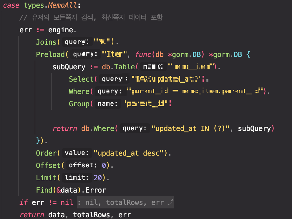 생각보다 코드가 명확해서 읽는 사람도 편하다 다만 서브쿼리의 경우 위에 보이는 것처럼 스트링으로 처리하기 때문에 오타가 나면 생각보다 찾기 어려우니 주의하자.