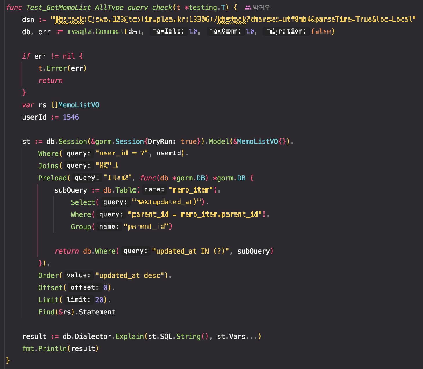 테스트 코드는 단순 쿼리 확인을 위해 dryrun 옵션을 세션에 추가해 작성했다.