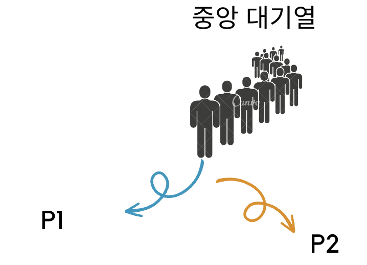 이렇게 대기하는 시간이 생각보다 많이 발생하게 된다. 이를 해결하기 위해 fifo 대기열을 적용해서 중앙 집중식으로 구성해서 본인이 가능할 때 작업을 빼가는 방식을 적용하는 것이다.