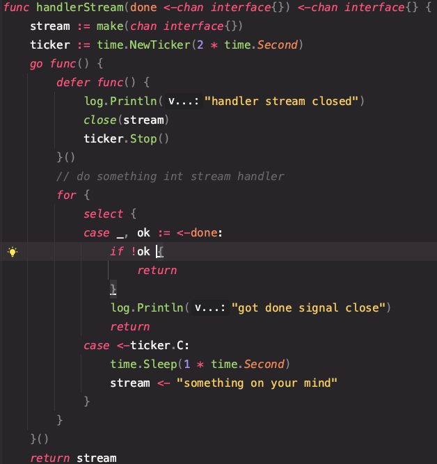 func handlerStream(done <-chan interface{}) <-chan interface{} {