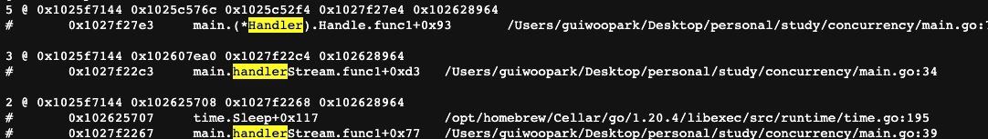 총 5개의 고 루틴을 트래킹 하고 있으며 핸들러, 스트림 모두 5개로 동일하다.
