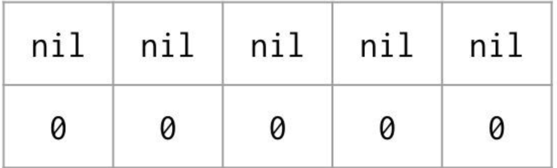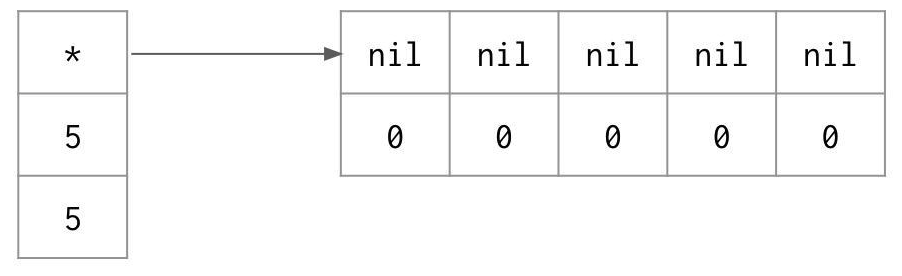 위와 같이 선언하게 되면 각 배열은 위의 그림과 같은 형태의 제로값으로 설정된다. 문자열은? 포인터와 길이를 표현하는 2 단어로 표현되기 때문이다.